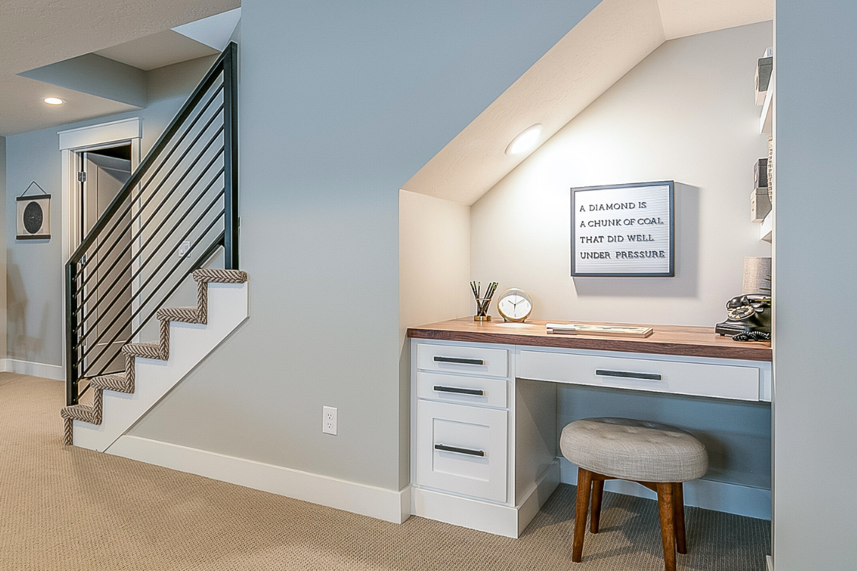 In smaller areas, walls are your best friend. We often add floating shelves, wall-mounted file holders, or even magnetic boards for rotating art and reminders.